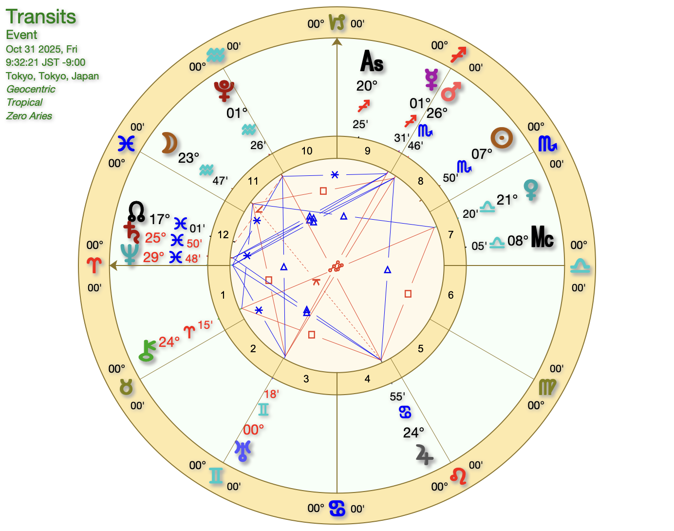 金星とキロンの180度って異性との人間関係っぽいですよねえ。過去の傷を癒やして前へ進む的な。そういうイベントが起こったり、そういう思考が湧き出てきたりするのでは。