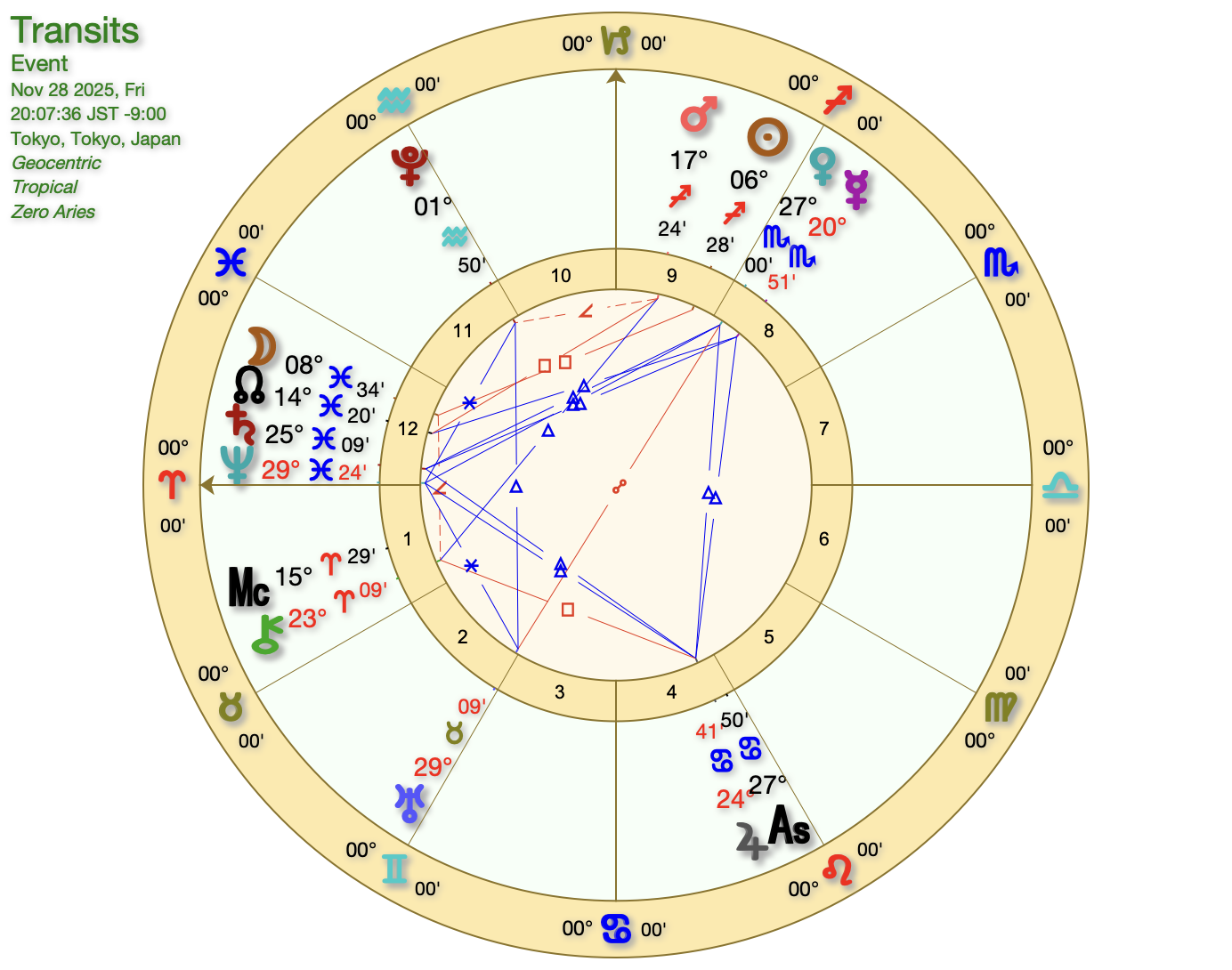 逆行する水星は金星とすれ違う。金星は射手座に向けて上げていく感じですが、ちょっと水星がそれに戸惑っているような印象を受けますね。